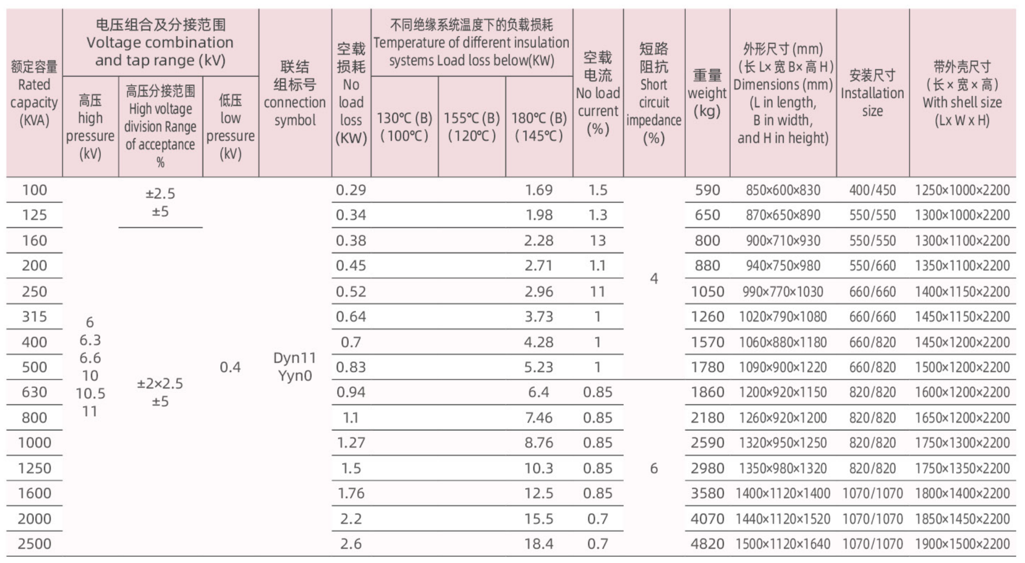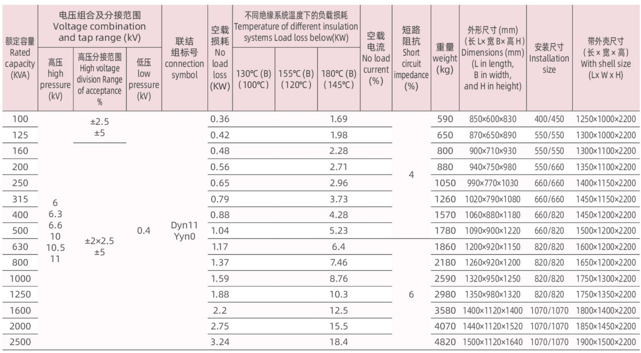 10kV级SG(B)11H级环保型干式变压器技术参数
