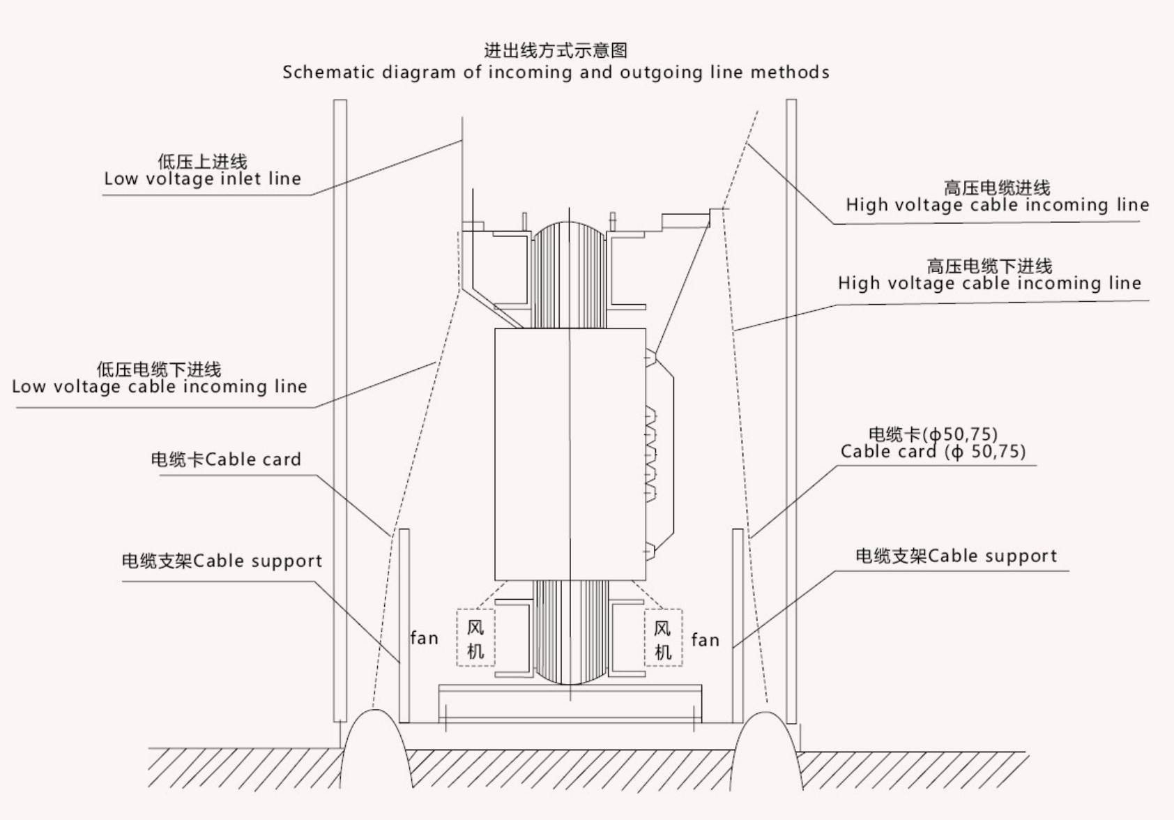 引出线 高压出线端子固定在绕组上部,分接头在绕组中部, 在 断电的情况下通过联接片变换抽头, 从而调节输出电压。 低压出线端子为板式导电排, 通过螺栓与引出排可靠连接。
